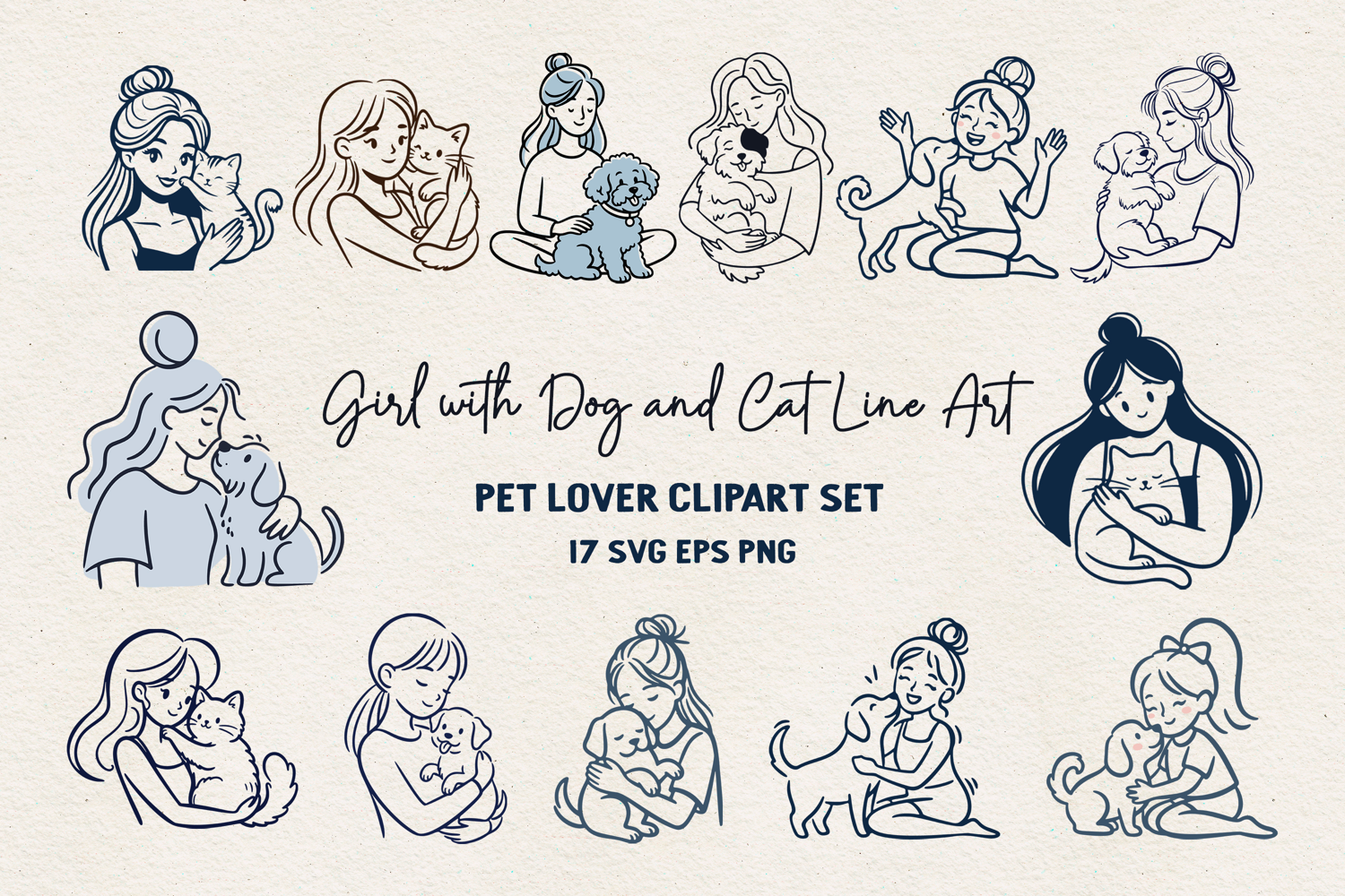 Girl with Dog and Cat Line Art SVG Bundle | Pet Lover Clipart | Woman with Pets Illustration | Cricut Cut Files | 17 PNG SVG