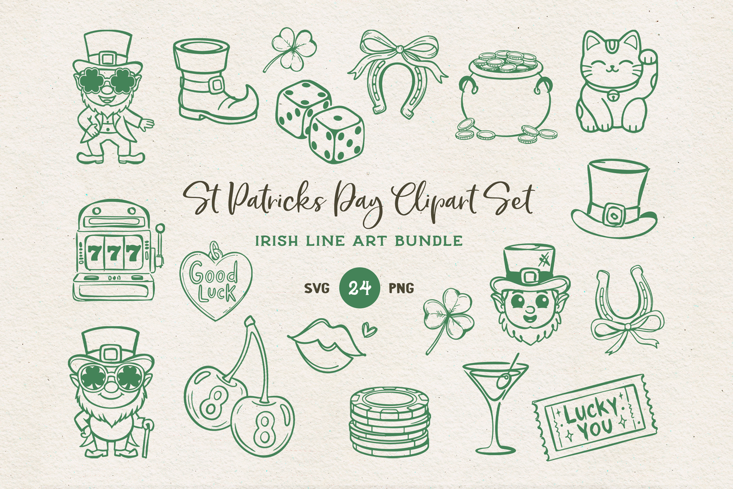 Celebrate Irish luck with this St. Patrick’s Day SVG bundle featuring a fun collection of lucky symbols and fortune-themed illustrations in a clean hand-drawn line art style.
