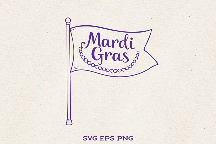 Festive Mardi Gras flag banner featuring classic carnival lettering and decorative bead detail. Perfect for Fat Tuesday shirts, party decor, parade signs, invitations, stickers and sublimation projects.
