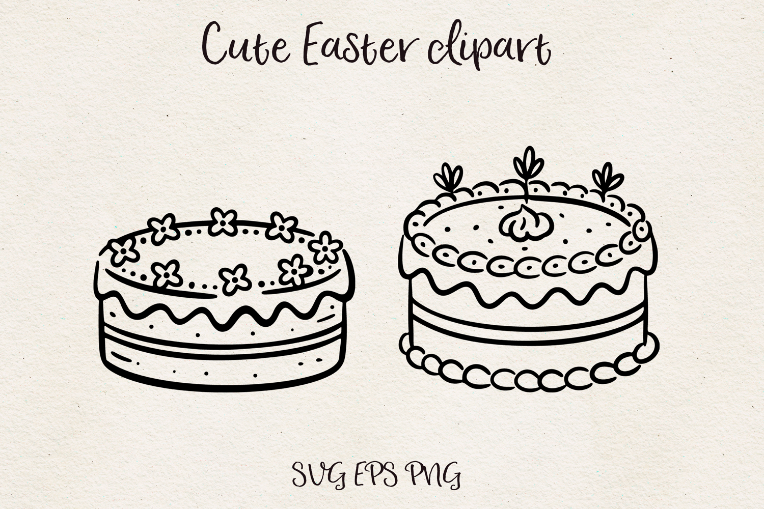 Cute Easter cake clipart set featuring two decorated festive cakes drawn in a charming minimal line art style. Perfect for Easter bakery designs, greeting cards, stickers, kitchen decor, and spring themed projects.