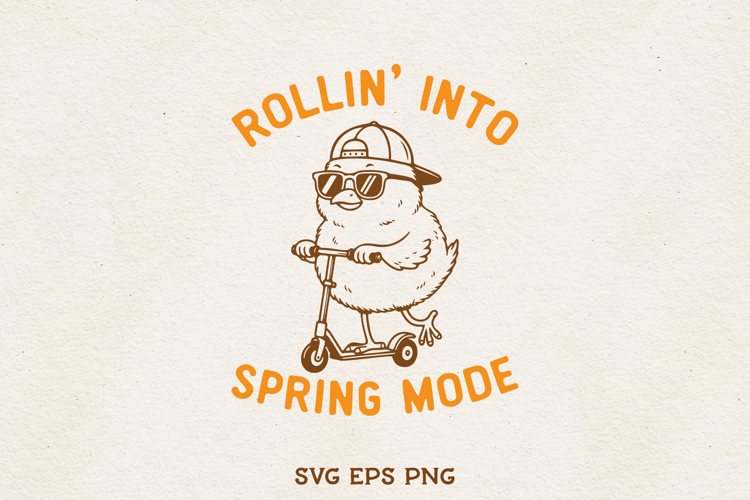 Cute and playful spring chick illustration with the phrase “Rollin’ Into Spring Mode.” The design features a cool baby chick wearing sunglasses and a cap while riding a scooter, creating a fun and lighthearted spring vibe.
