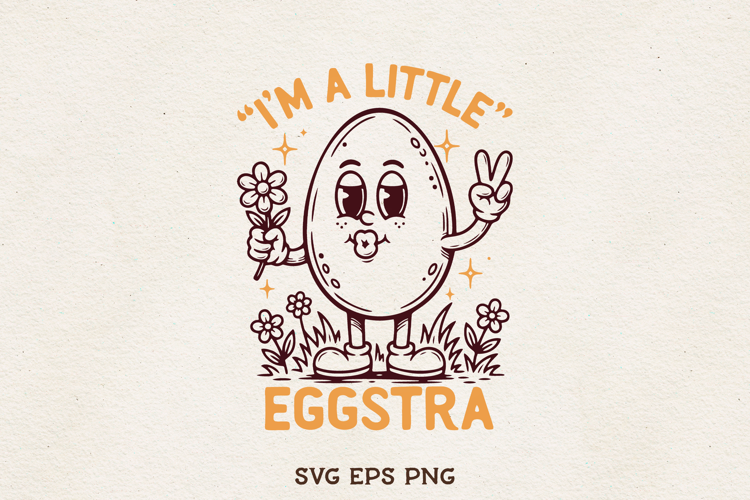 Adorable Easter egg character design with the playful phrase “I’m a Little Eggstra.” This cute illustration features a smiling egg holding a flower and making a peace sign while standing in spring grass with tiny flowers.