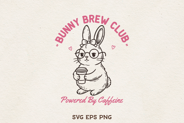 Cute and cozy coffee bunny design with the phrase “Bunny Brew Club – Powered By Caffeine.” This adorable illustration features a bunny wearing glasses and a bow, holding a coffee cup, surrounded by small hearts for an extra charming touch.