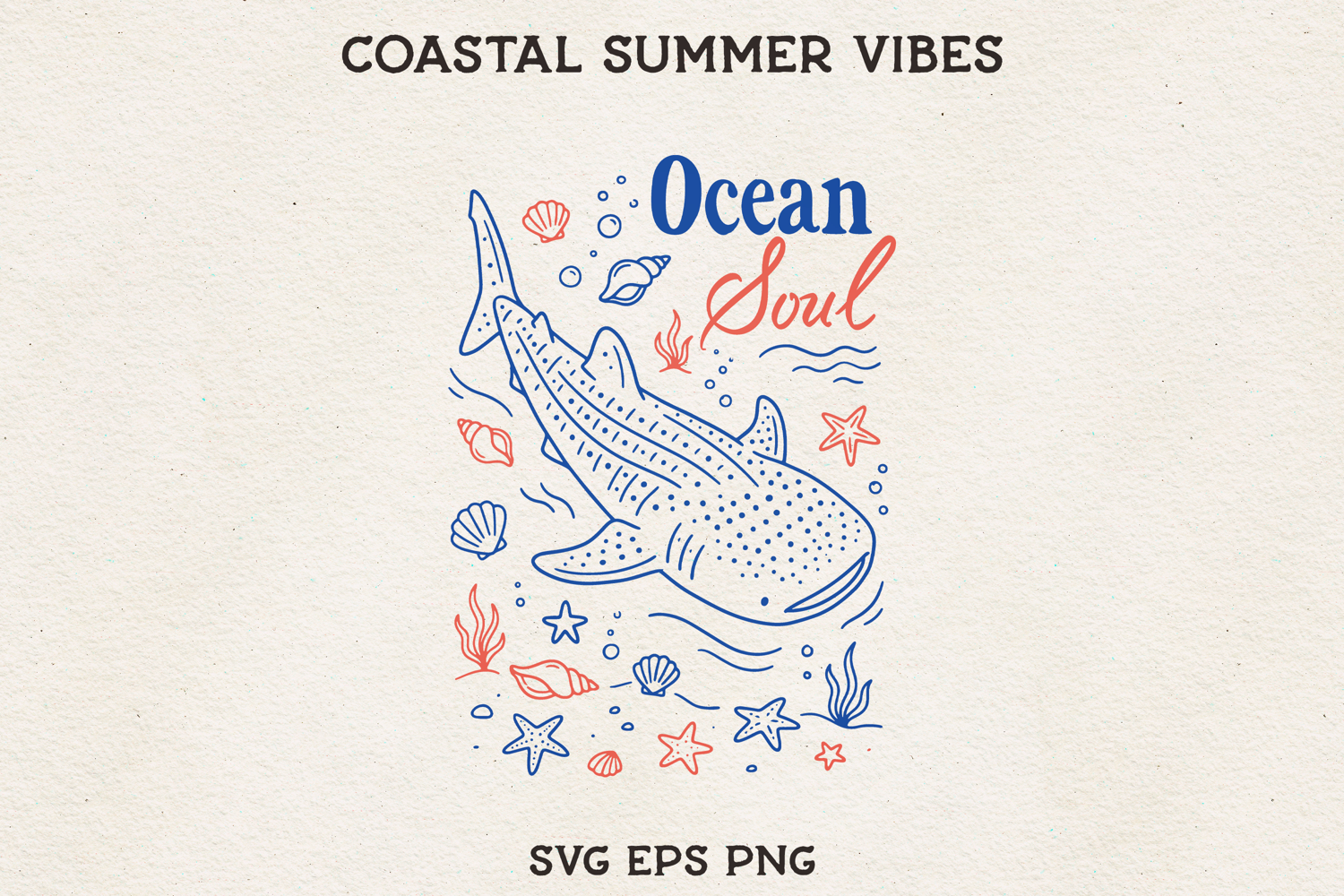 Ocean-inspired illustration featuring a whale shark surrounded by seashells and sea elements with the phrase “Ocean Soul.” Perfect for marine life lovers and coastal-themed crafts.