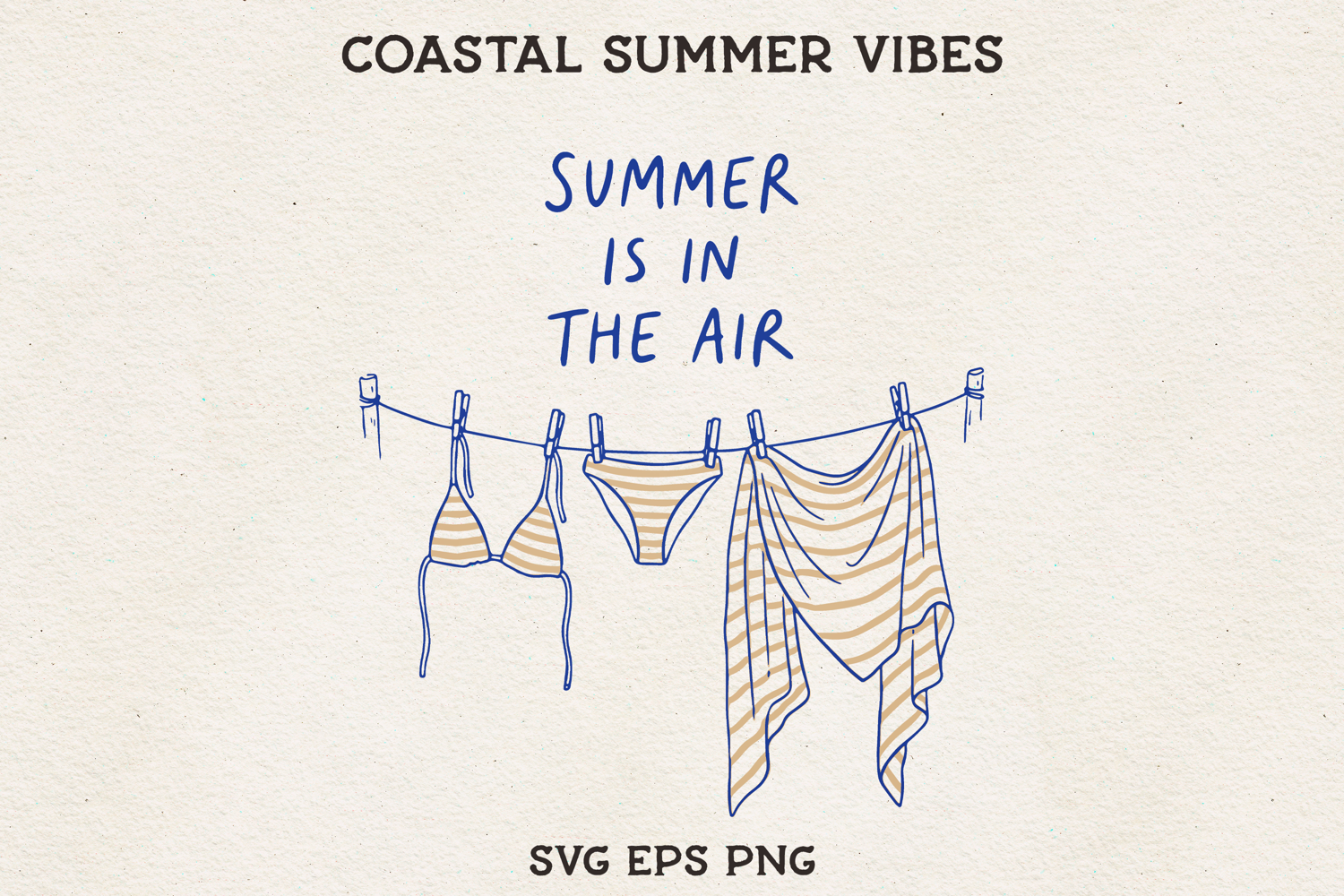 A charming coastal summer design featuring a bikini and beach towel hanging on a laundry line with the phrase “Summer Is In The Air.” Perfect for beach lovers, summer crafts, and vacation projects. Clean minimal line art style ideal for cutting machines and print designs.