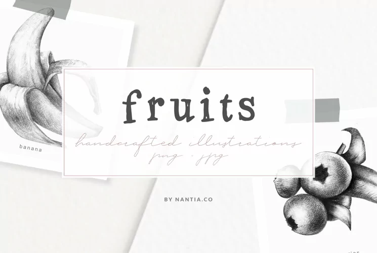 This handcrafted illustration pack includes illustrations of fruits made with graphite. With a variety of file types, such as JPG or PNG with transparent background, this illustration pack is ready to use. Ideal for fruit branding, restaurant menus, juice stands and food packaging.The "Hand drawn Fruit Collection Illustrations" Pack includes:Graphite Version: