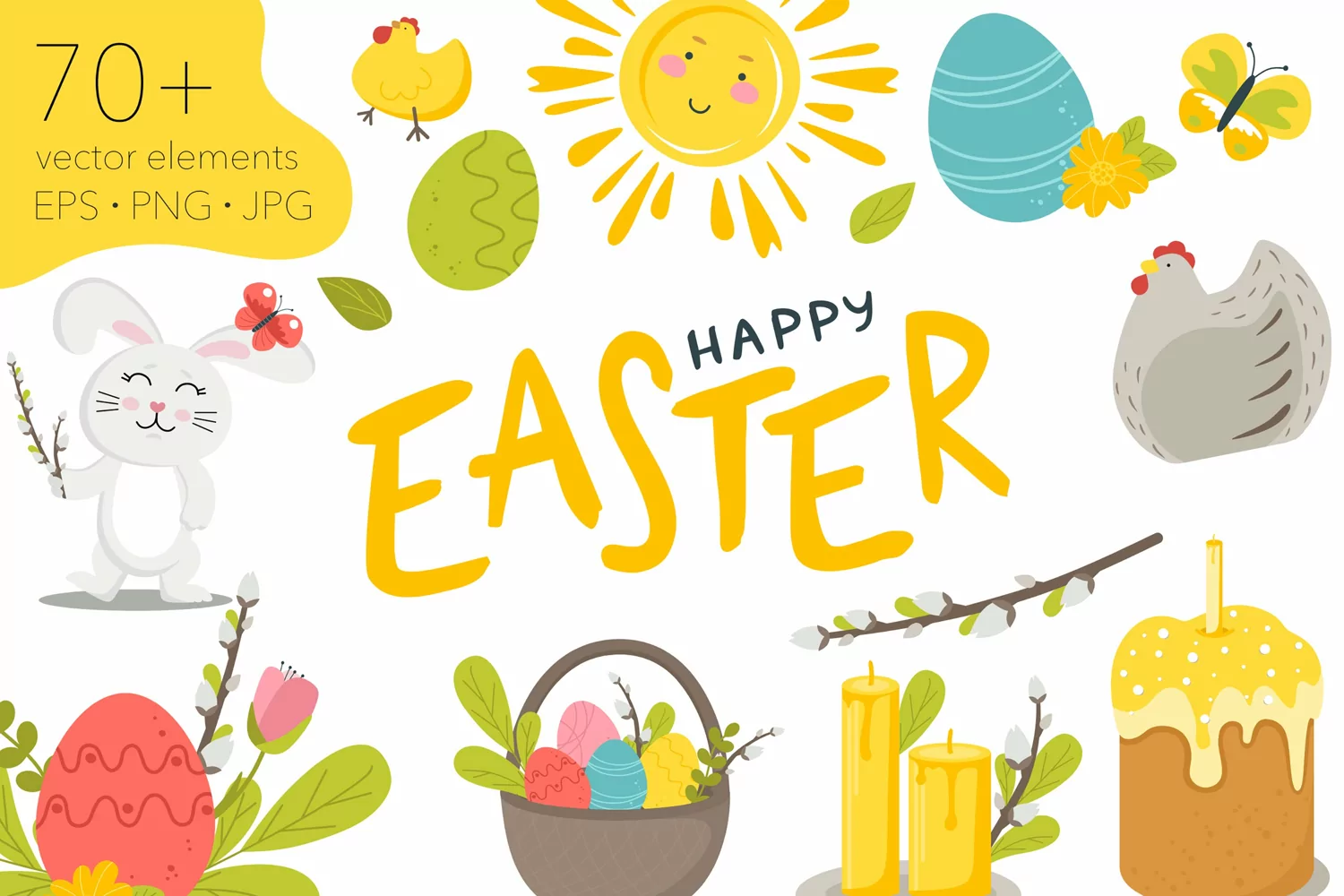 This is a collection of more than 70 design elements from vector illustrations and various elements for the Happy Easter holiday.