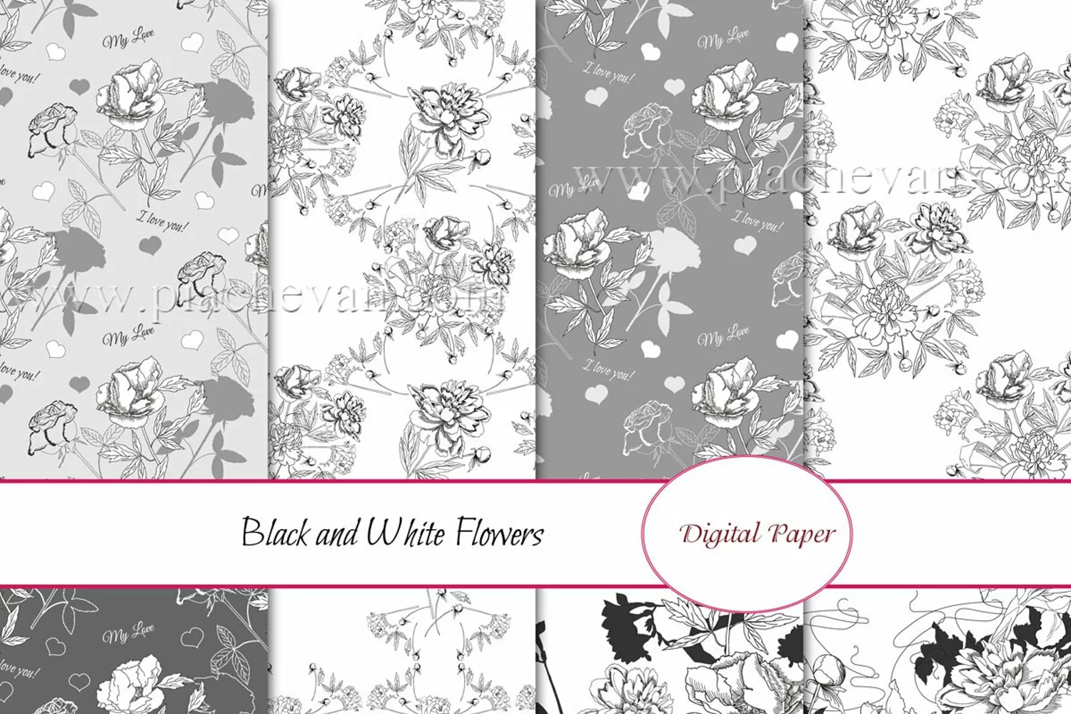 Set digital paper. Patterns with black and white flowers.