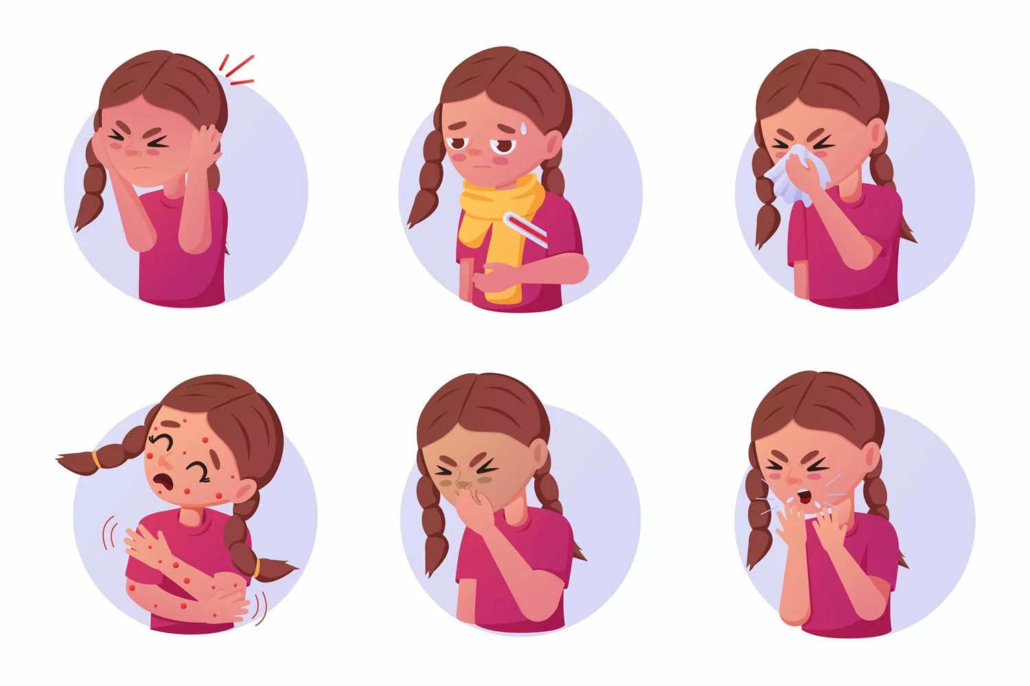Flu fever. Ill kid coughing and sneezing. Illness symptoms set. Diseases and ailments. Children allergy. Unhealthy character. Girl in cold, measles or asthma. Vector isolated cartoon unwell persons