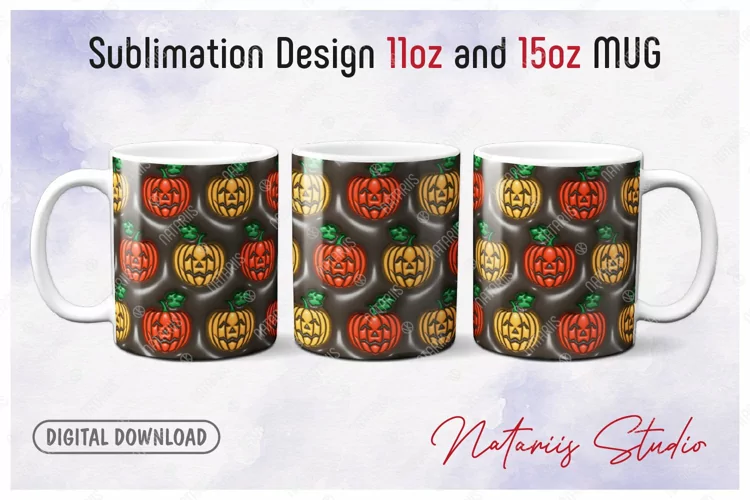 3D Inflated Puffy Halloween Pumpkin Pattern for 11oz and 15oz MUG. Digital Design for Sublimation.