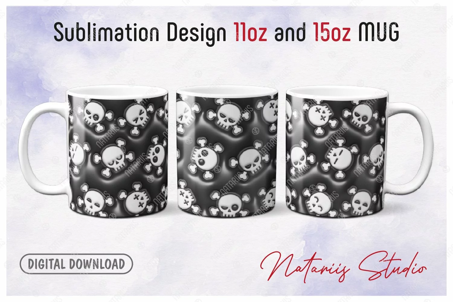Funny 3D Inflated Puffy Halloween Skulls Pattern for 11oz and 15oz MUG. Digital Design for Sublimation.