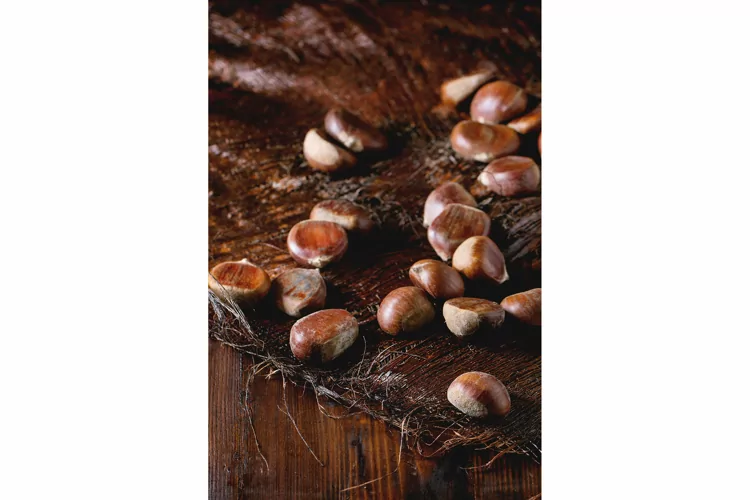 Heap of Uncooked edible chestnuts over old wooden table. Top view