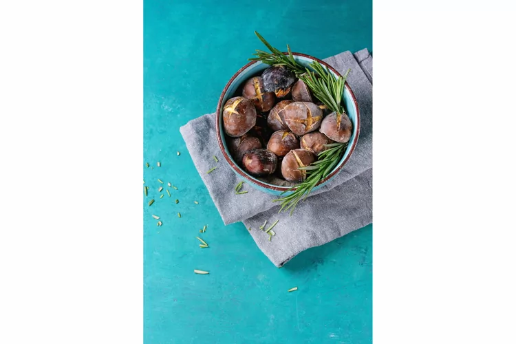 Roasted chestnuts in the ashes with rosemary in turquoise ceramic bowl on textile napkin over bright blue wooden background. Top view with space for text.