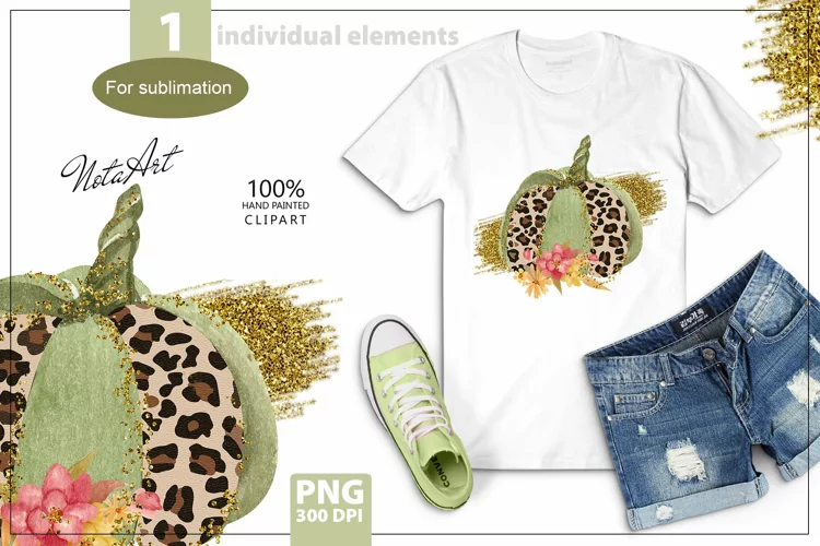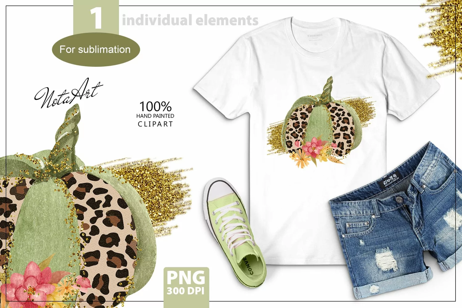 Green Pumpkin with Gold Sublimation , Autumn T-shirt PNG example image 1