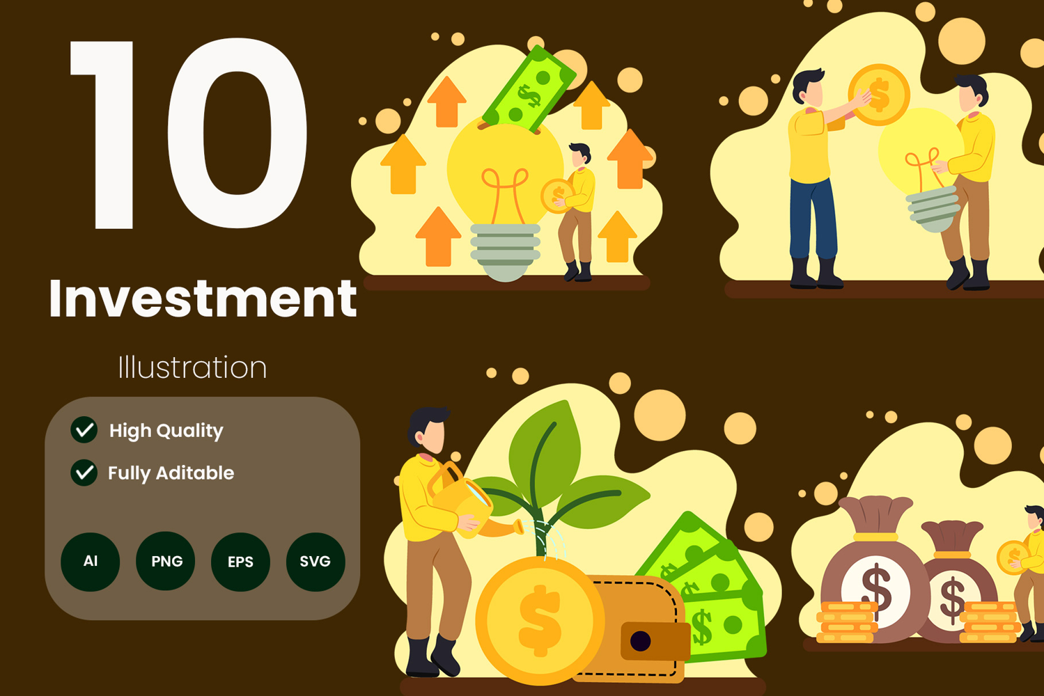 Ideal for designers, marketers, and business professionals, this Investment Illustration Pack offers flexibility and scalability for any project. With its variety of file formats, you can easily edit, resize, and adapt the illustrations without losing quality. Enhance your financial content with engaging visuals that highlight concepts of wealth, planning, and success.