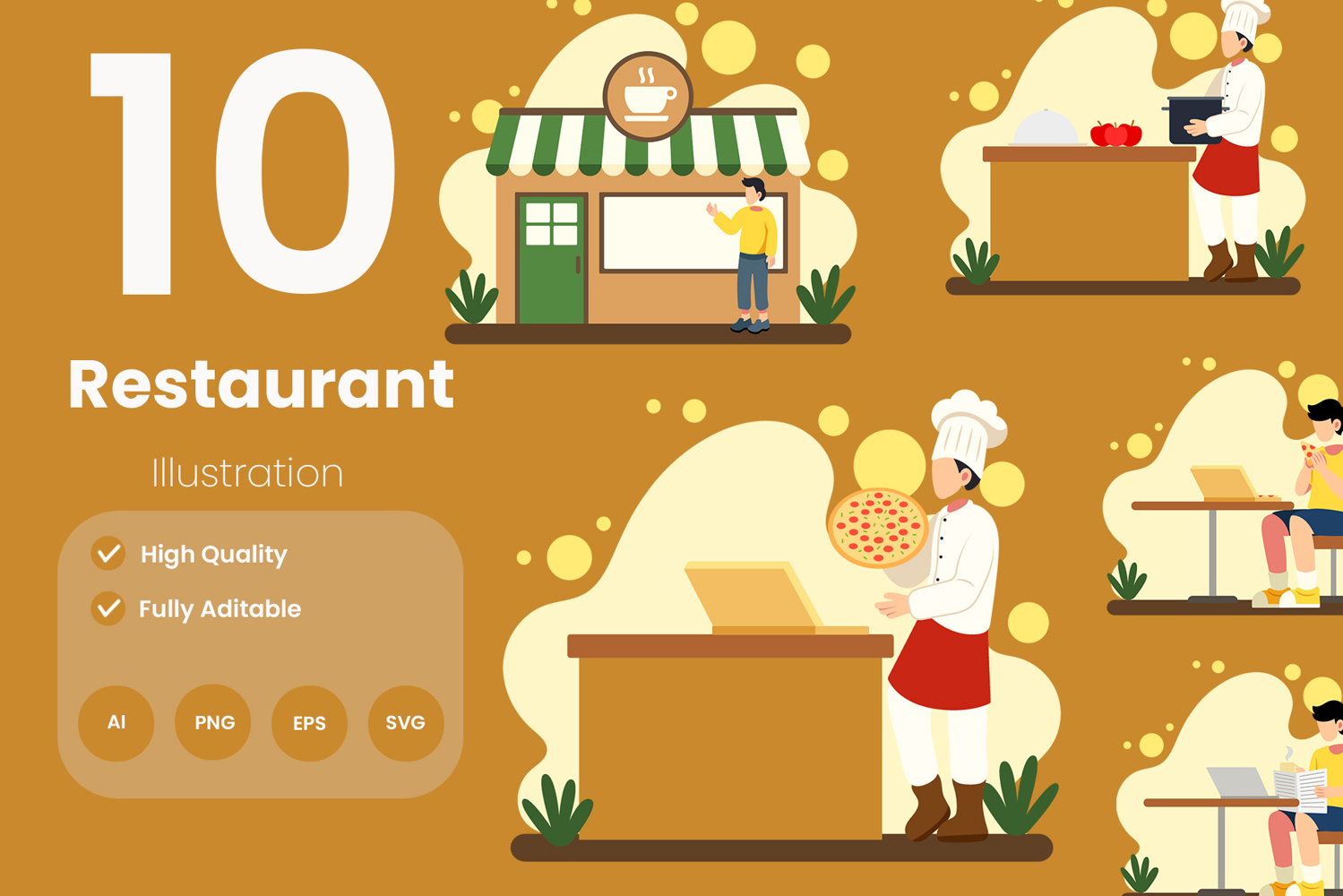 Restaurant Illustration Pack is a creative collection of high-quality vector and raster files designed to bring a professional touch to any food or dining-related project. This pack includes editable AI, JPG, PNG, SVG, and EPS formats, making it versatile and easy to use across different platforms and design software. Each illustration is crafted with clean lines, modern style, and eye-catching details, suitable for both digital and print purposes.