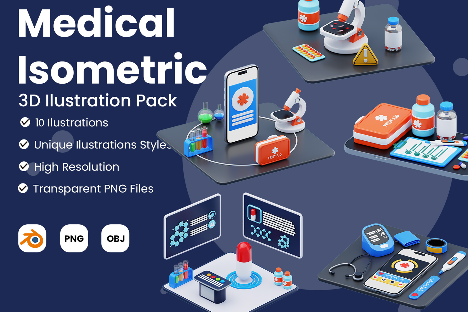 A high-quality medical isometric 3D illustration pack designed for professional use in healthcare projects, educational materials, and digital presentations. This collection includes detailed medical elements created in a clean isometric style, suitable for websites, apps, infographics, and advertising.