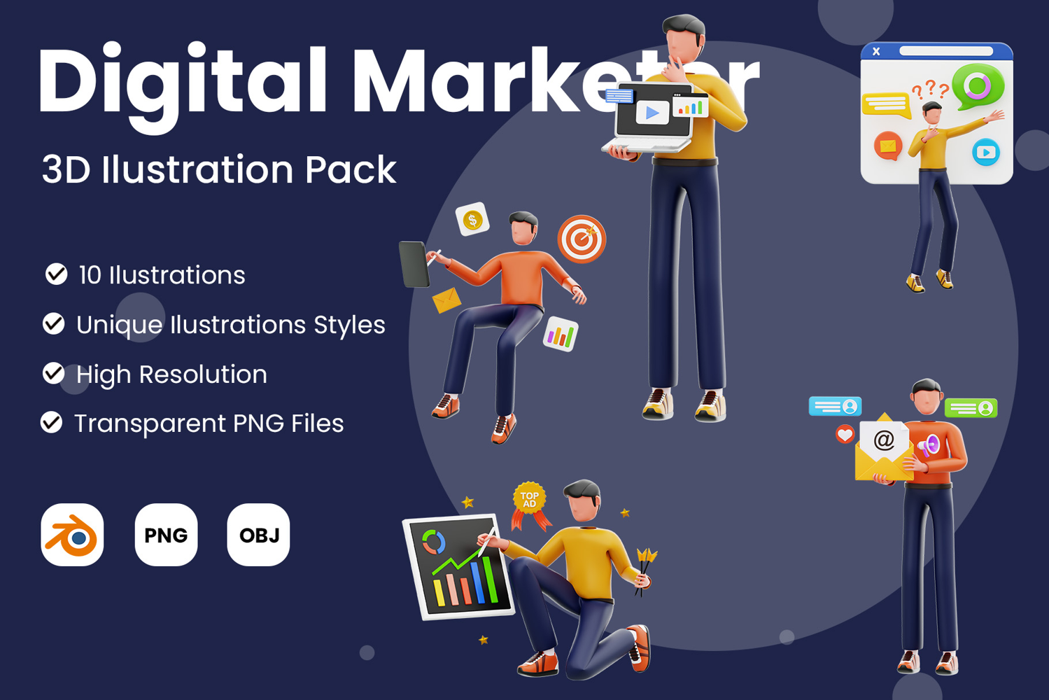 Digital Marketer 3D Illustration Pack is a modern and professional collection of 3D visual assets created to represent digital marketing activities and online business strategies. This pack showcases engaging illustrations related to social media marketing, content creation, SEO, analytics, advertising campaigns, email marketing, and brand growth in a clean and contemporary 3D style.
