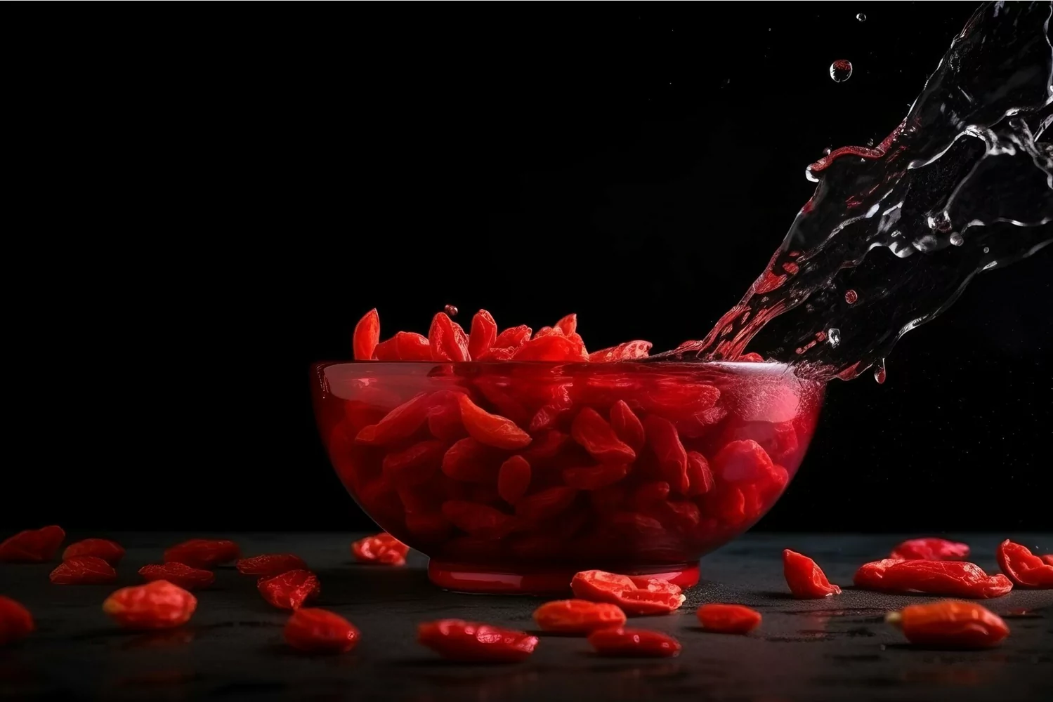 Best goji berries on black background. Fruit with water drops. Generate Ai