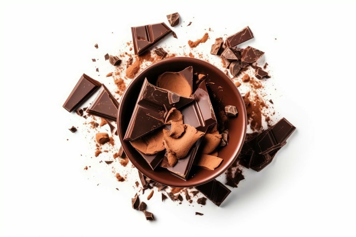 Bowl milk chocolate bowl. Food top view. Generate Ai