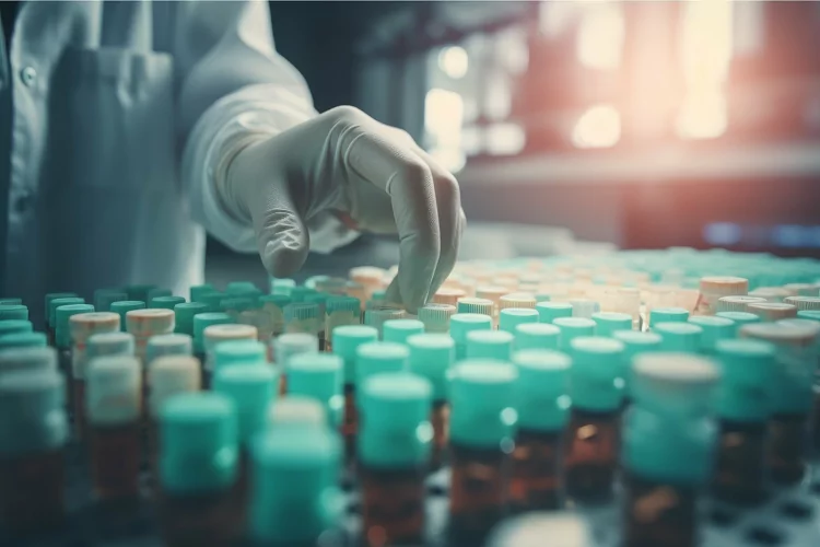 Hand medical vials. Lab research. Generate Ai