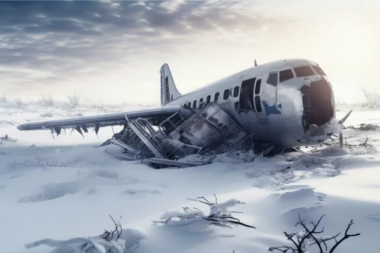 Crashed plane winter forest landscape. Snowy cargo. Generate Ai