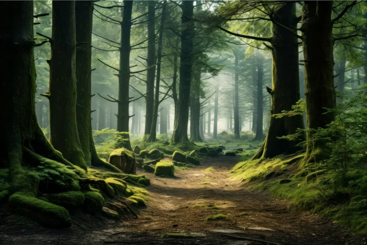 Similar Design Products to Beautiful trees in forest with moss on stones. Generate Ai
