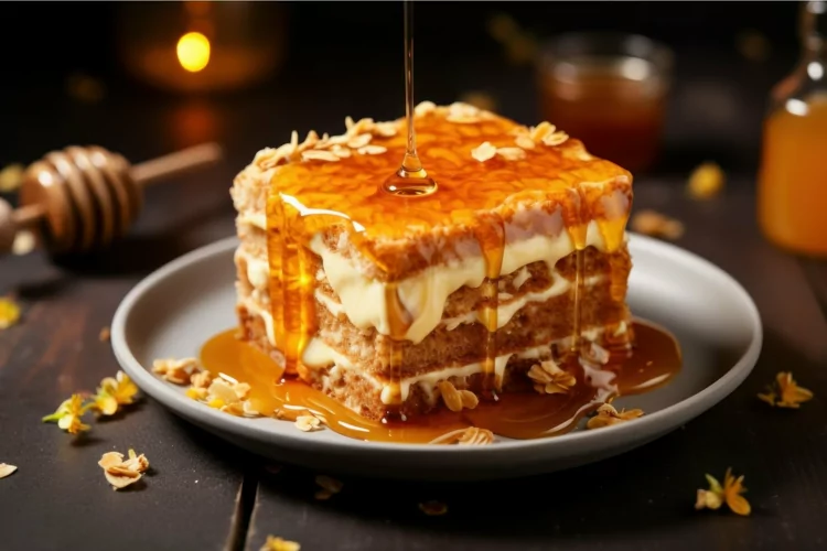 Tasty dessert cake with oat flakes and honey on table. Gener