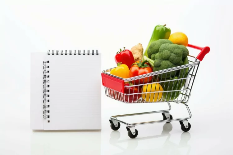 Shopping list in paper notebook with full cart of products. Buy memo organizer. Generate Ai