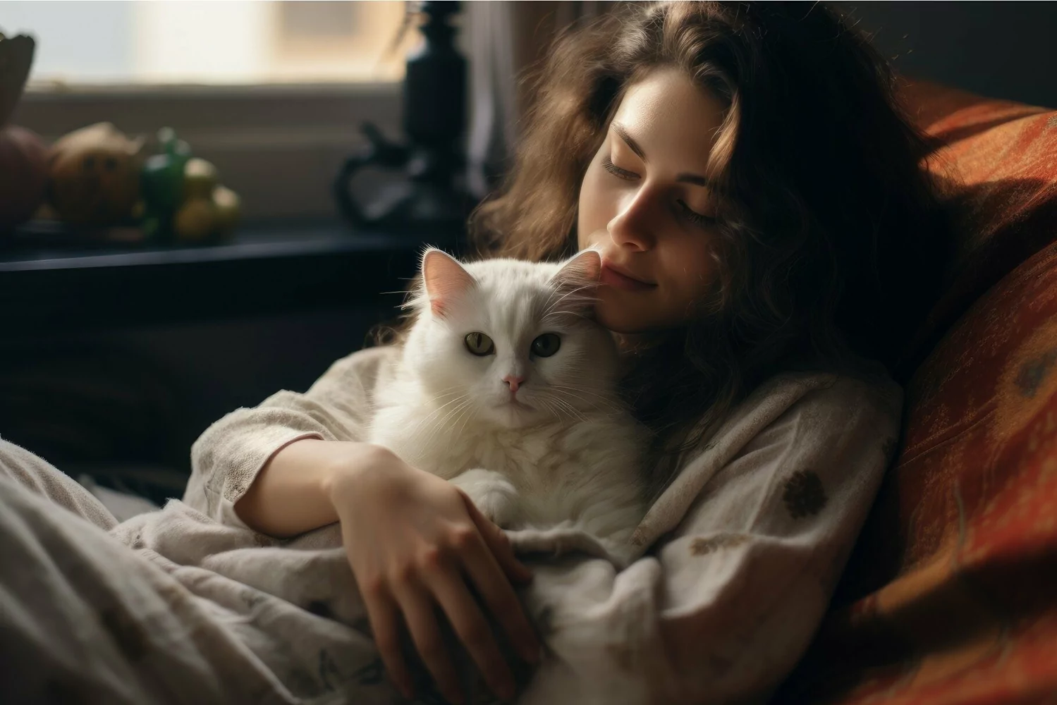 Beautiful woman petting cute white cat on soft sofa. Adorable care family kitty adult. Generate Ai