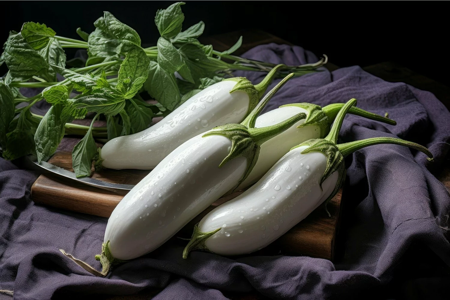 Fresh white eggplants on wooden table. Nature kitchen organic ingredient food. Generate Ai