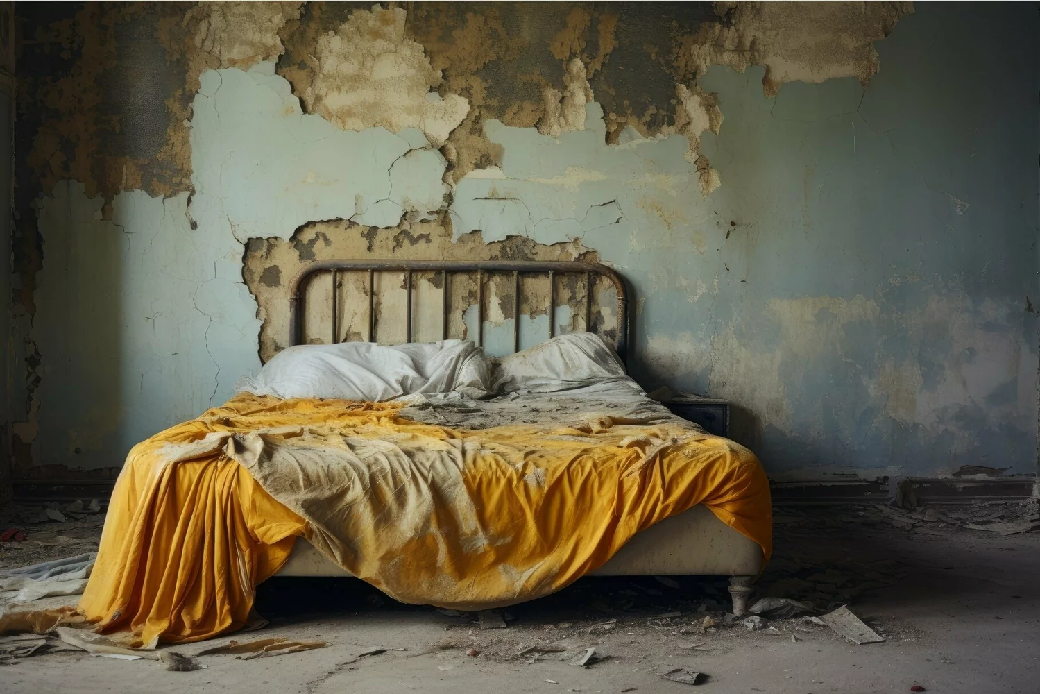 Bed rotting in old room house with dirty wall. Urban ruined wall aged. Generate Ai