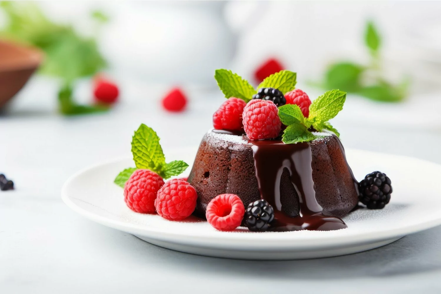 Plate with delicious chocolate fondant with fresh berries. Vegan pie dessert food. Generate Ai
