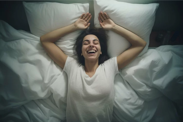 Woman happy waking from bed. Top view of happy morning female. Generate Ai