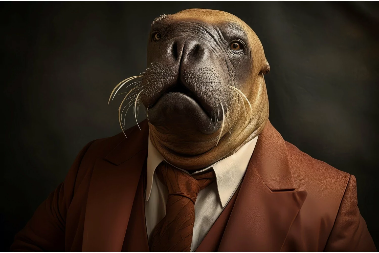 Anthropomorphic walrus wearing formal classic suit. Generate