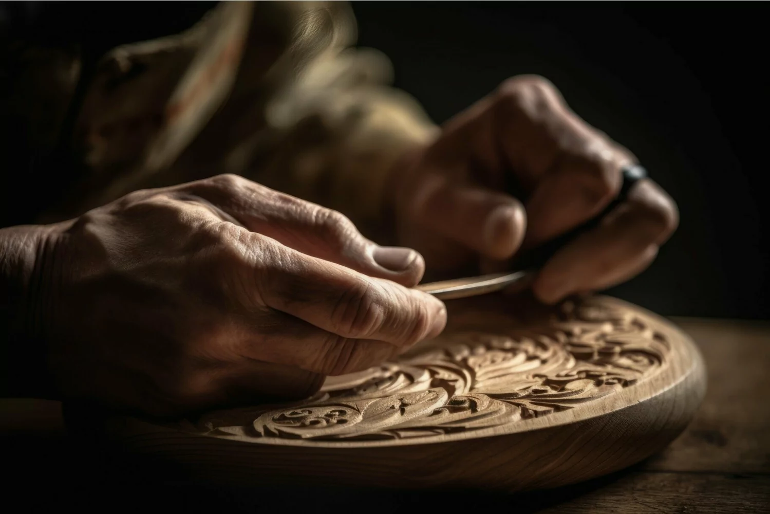 Carving hands wooden decorative plate . Handmade woodcarving craftsman creative hobby. Generate ai