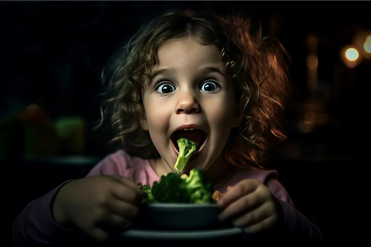 Funny girl broccoli lettuce portrait. Health hungry green breakfast infant. Generate Ai