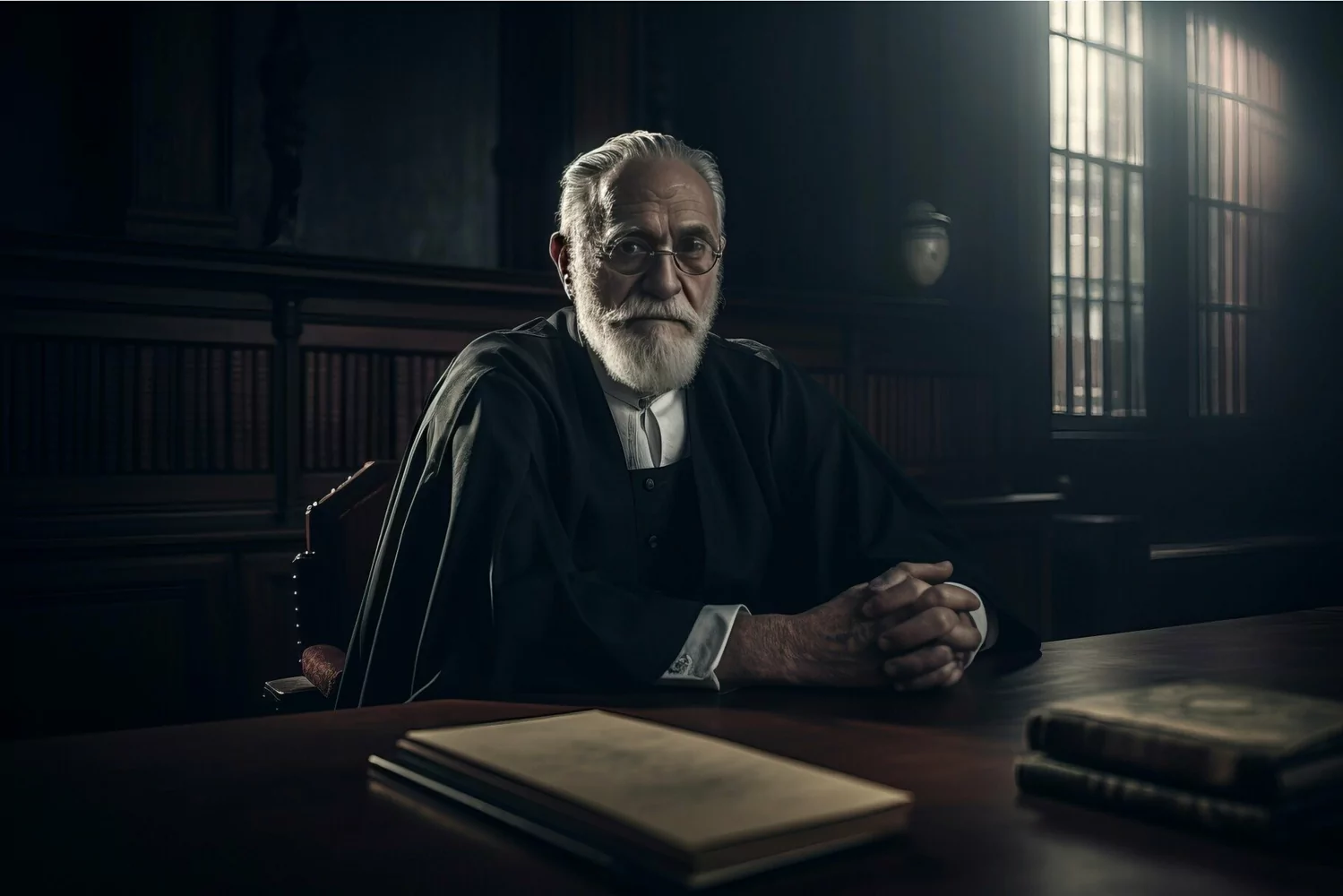 Brooding man looming desk. Serious and wise judge with round glasses. Generate AI