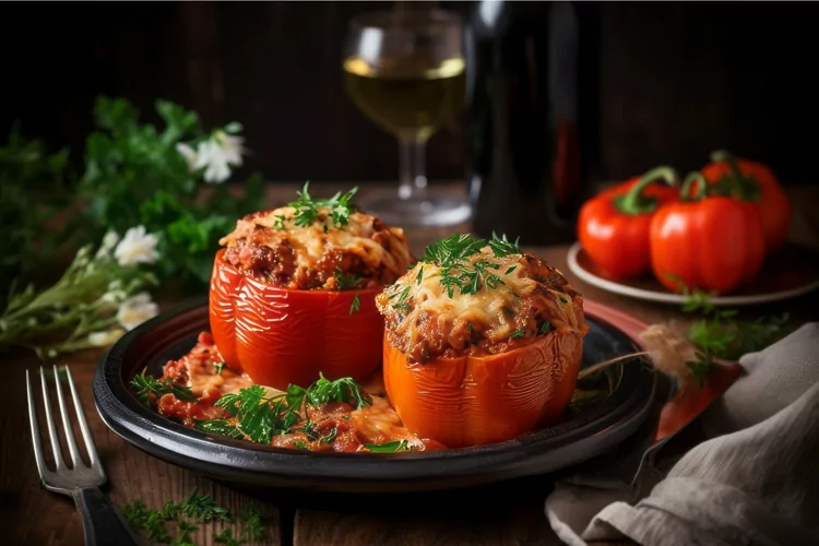 Meat Baked Serving Plate Vegetable Filled Capsicum Peppers Rice Stuffed