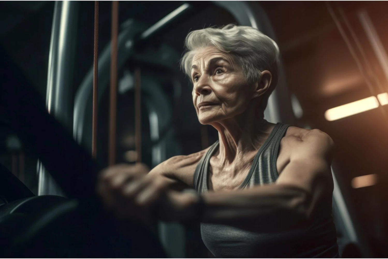 Concentrated fit elderly woman lifestyle. Older positive physical machine. Generate Ai