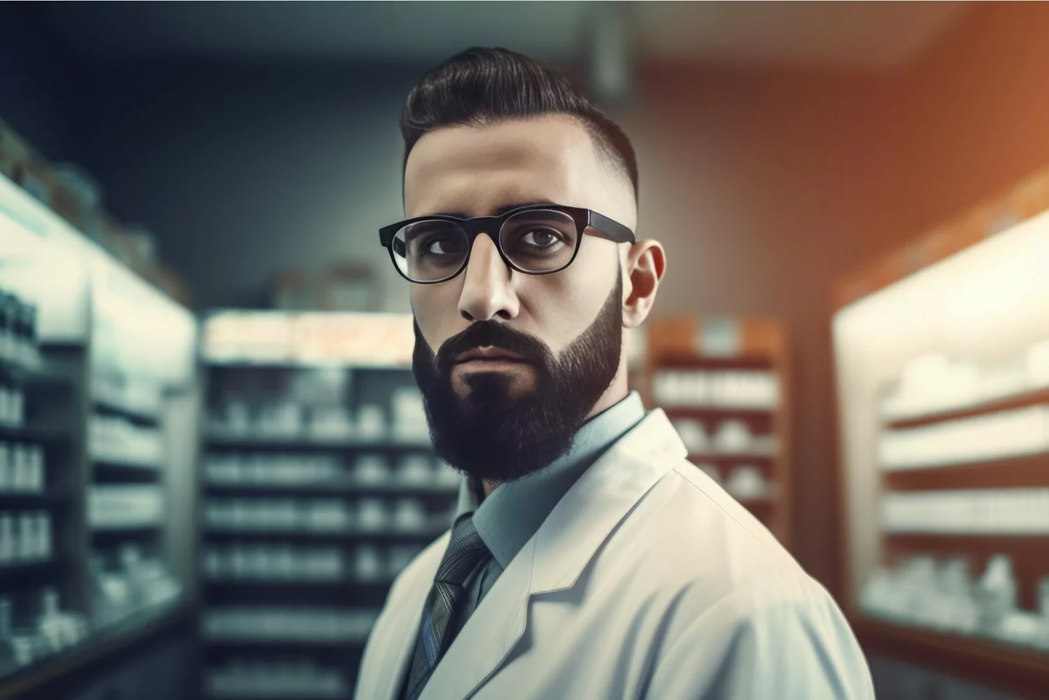 Bearded pharmacist medicine counter. Man with eyewear in apothecary medical shop. Generate ai