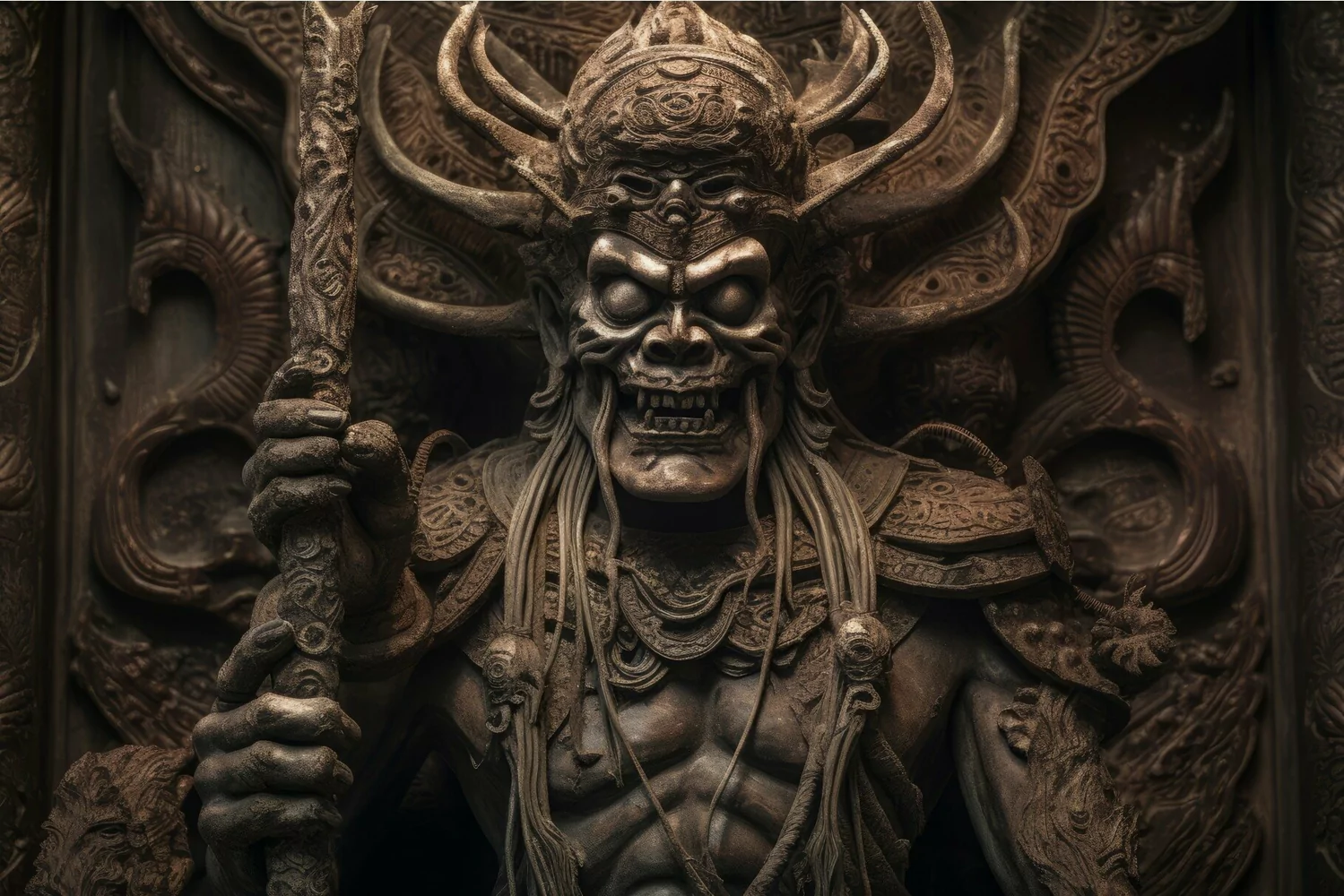 Yama lord death. Ancient and mythical stoneware statue ancient beast. Generate AI