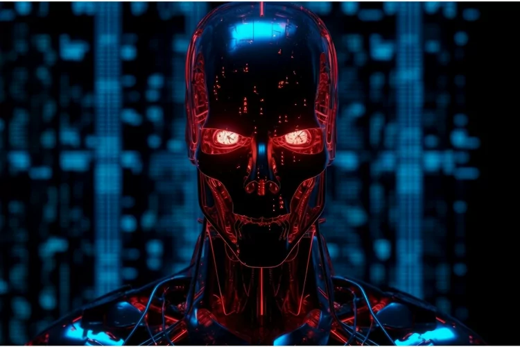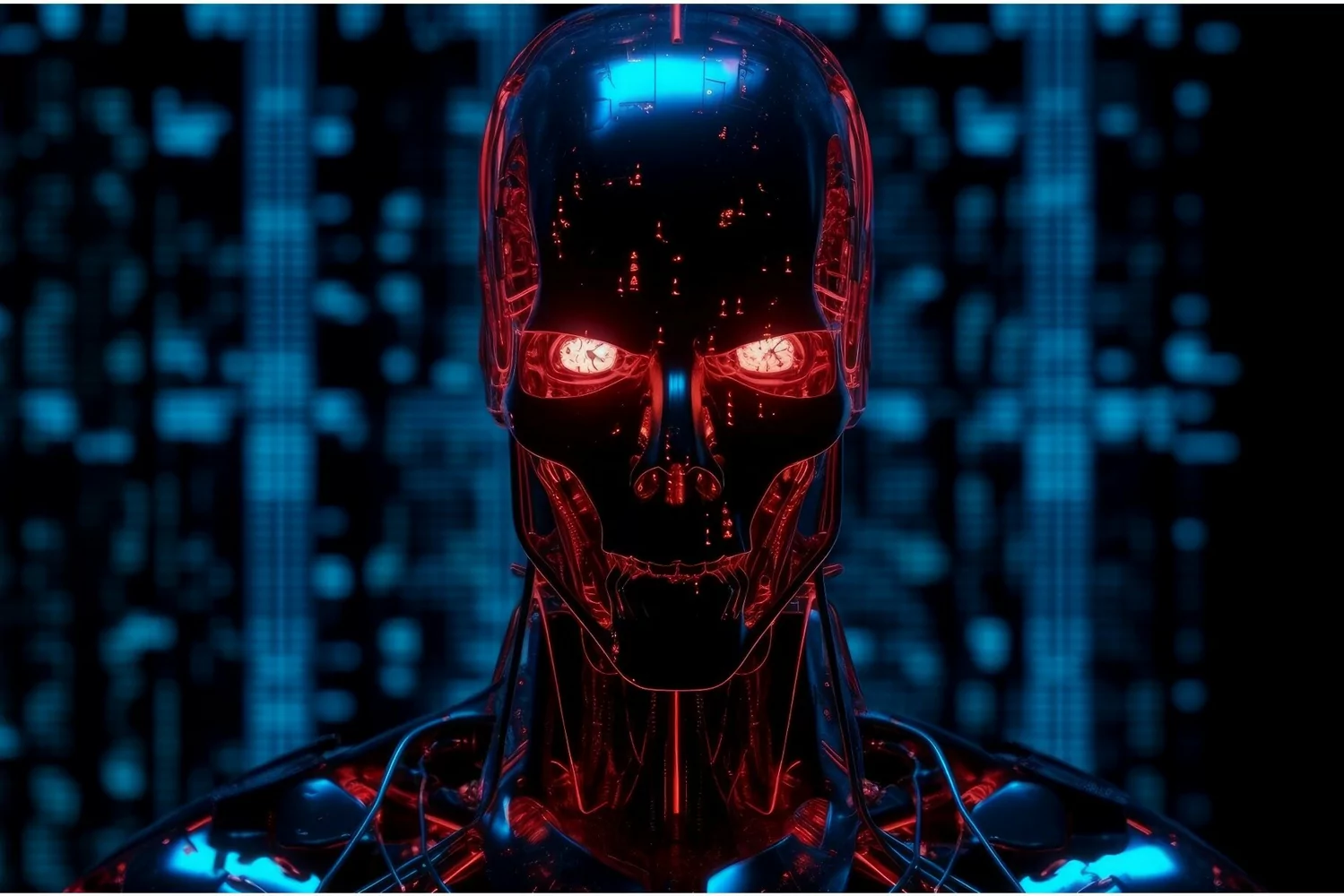 Artificial intelligence over heating. Rugged red eyed robot human form. Generate AI
