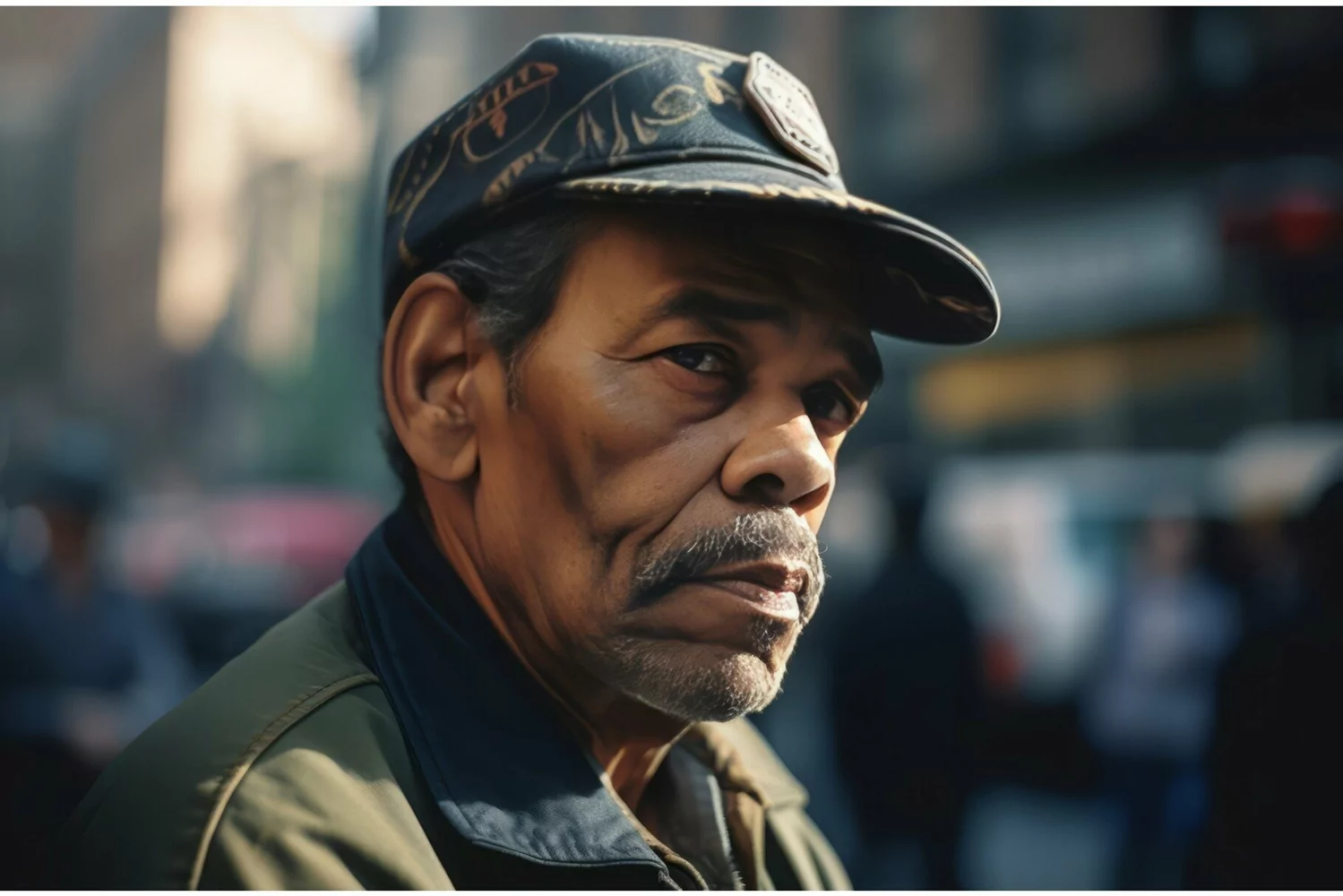 Authentic ordinary common man on street. Black male with cap downtown boulevard portrait. Generate ai