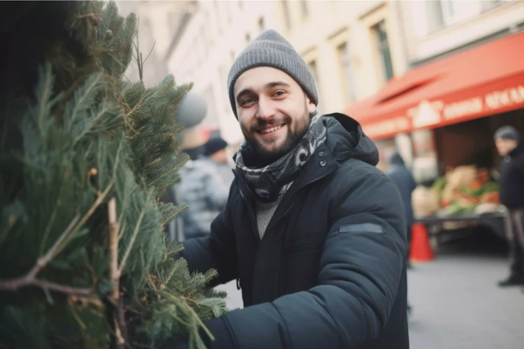 Similar Design Products to Delighted man selling Christmas trees. Generate ai