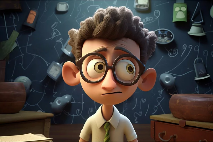 Confused genius with glasses at schoolboard cartoon. School clever teacher educator at blackboard. Generate ai