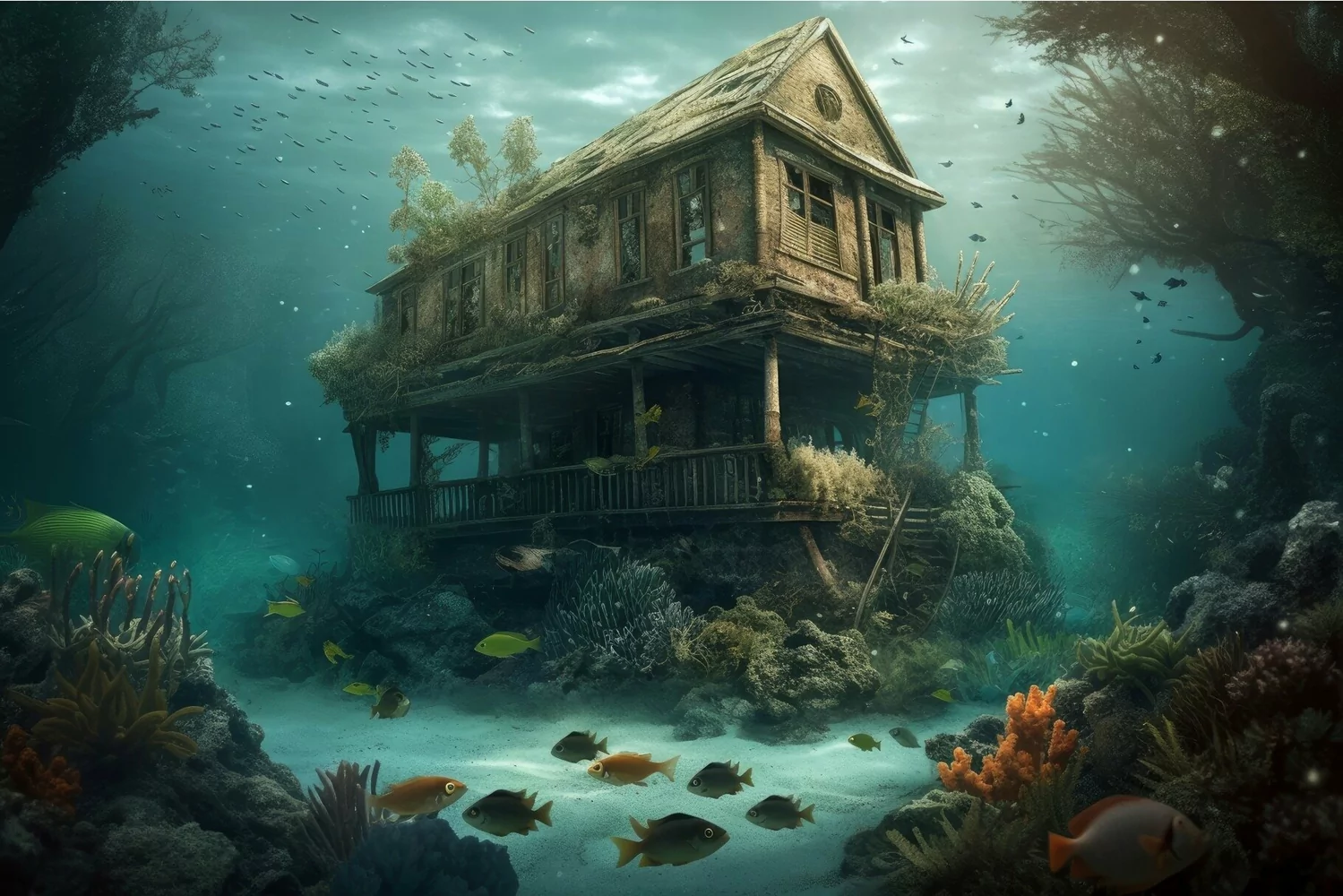 Mystic house under water. Generate ai example image 1