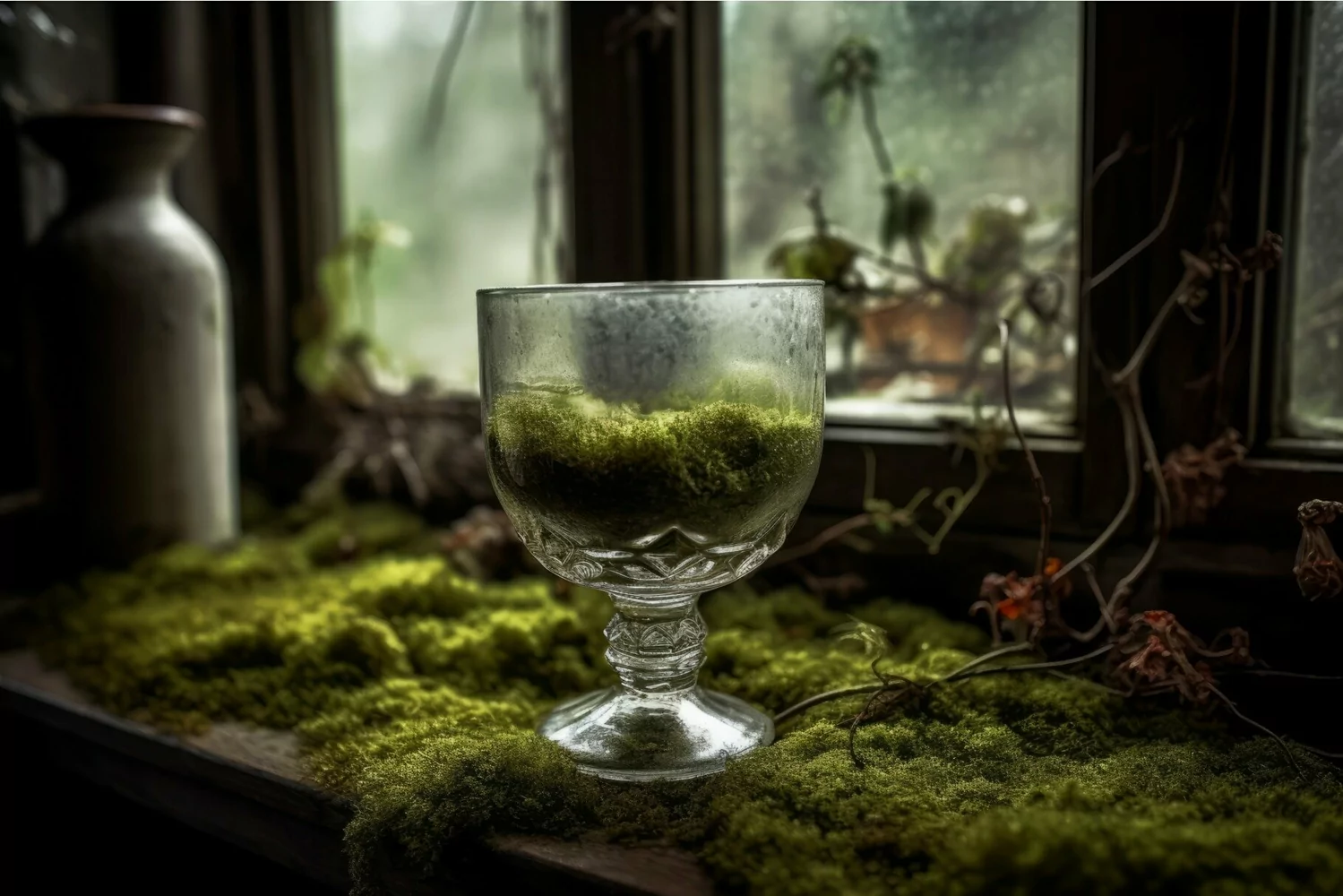 Glass old house on moss desk near window. Detail street architecture wood. Generate Ai