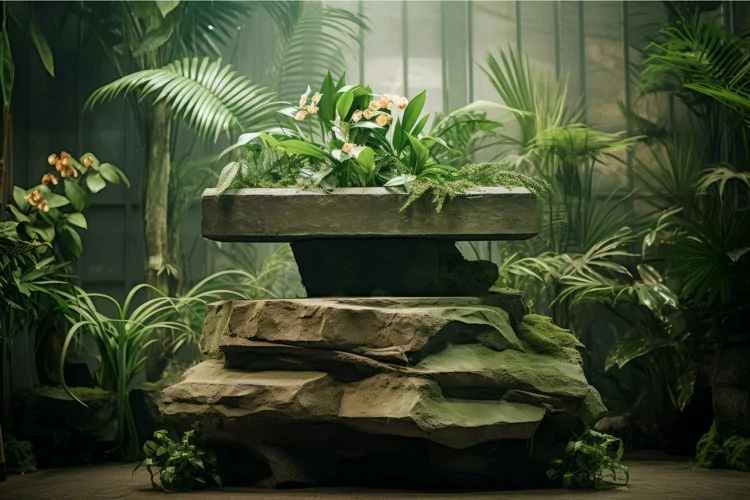 Natural Rock Garden Orchids Vegetation Lush Misty Ferns Greenhouse Tranquil