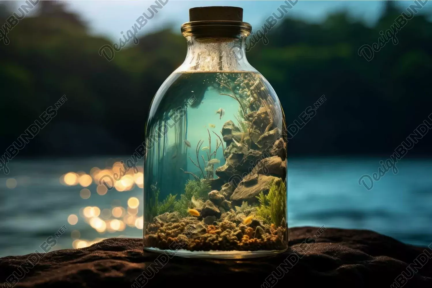 Captivating terrarium bottle showcasing a tiny underwater scene against a tranquil lake backdrop